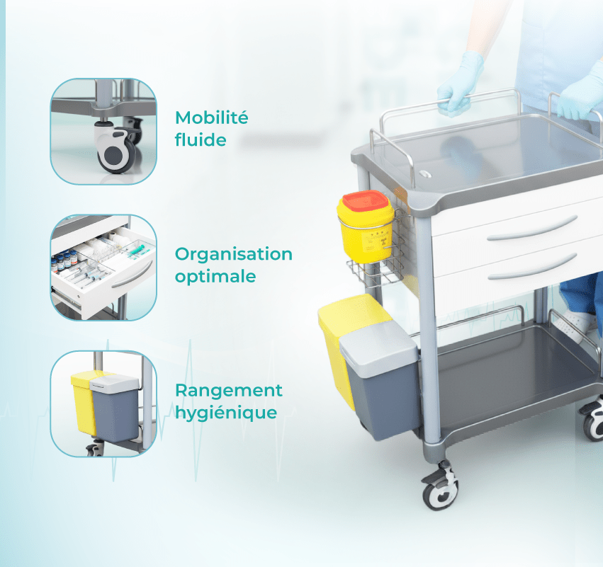 Léger – Compact et ergonomique Le chariot permet de stocker et de transférer tout le matériel de traitement pouvant être nécessaire lors des interventions d’urgence dans les services d’urgence et les unités de soins intensifs.